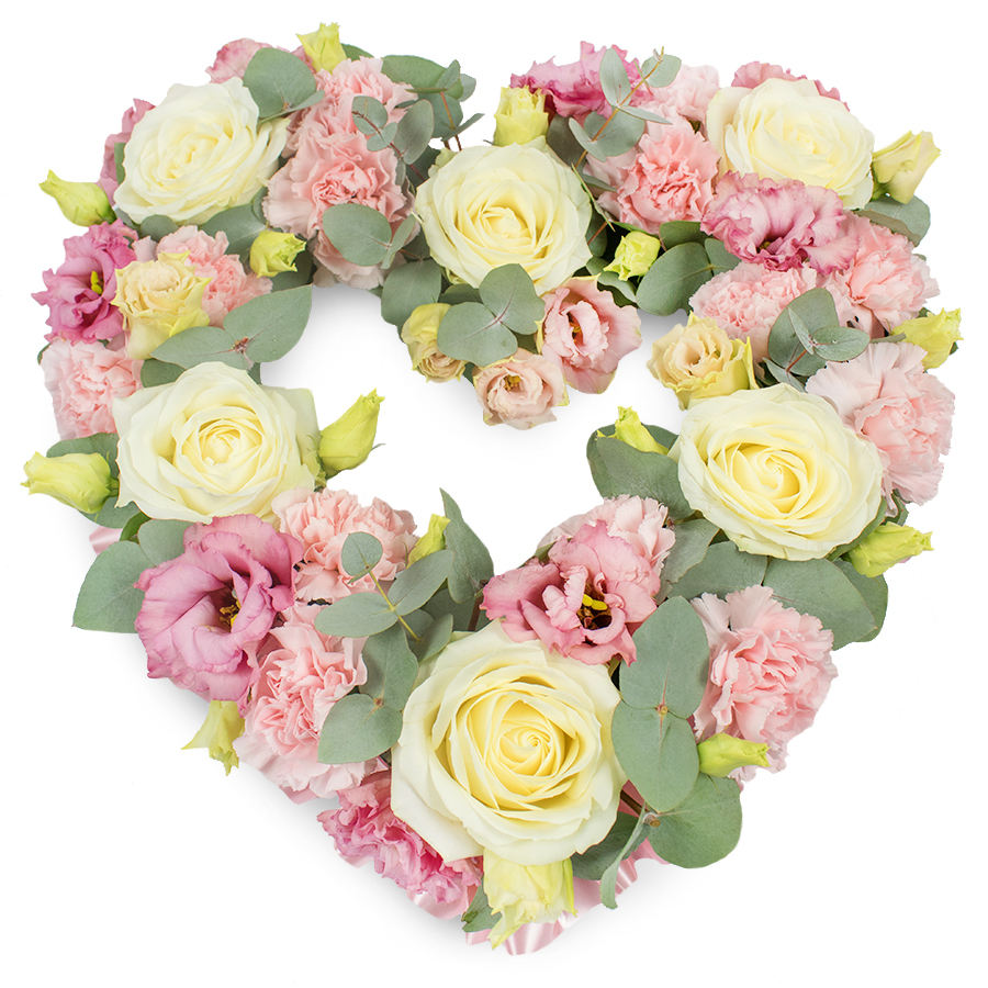 Express your deepest emotions with our sophisticated open heart bouquet. This refined arrangement showcases a beautiful combination of white roses, pink carnations, elegant pink lisianthus, and fresh eucalyptus leaves.