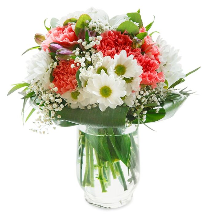 Celebrate special moments with our stunning white and pink floral arrangement. This bouquet combines pure white chrysanthemums and delicate gypsophila with vibrant light pink carnations, all beautifully arranged with lush aspidistra leaves. The unique design and harmonious colors make it a perfect luxurious gift.